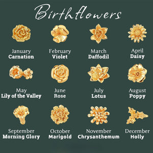 Crafted with exquisite gold-tone detailing, every piece features a unique birth flower, representing the month of your birth and the qualities it embodies—whether it’s the strength of a carnation, the purity of a lily of the valley, or the joy of a daisy. Perfect as a sentimental gift for a loved one or a timeless keepsake for yourself.