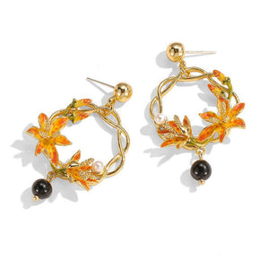 Enhance your look with the Blackberry Lily Hoop Earrings. These intricate designs feature hand-painted enamel lilies, black onyx pendants, and pearl accents, all suspended from gold-tone hoops. Perfect for creating a statement, these earrings blend floral charm with contemporary elegance.