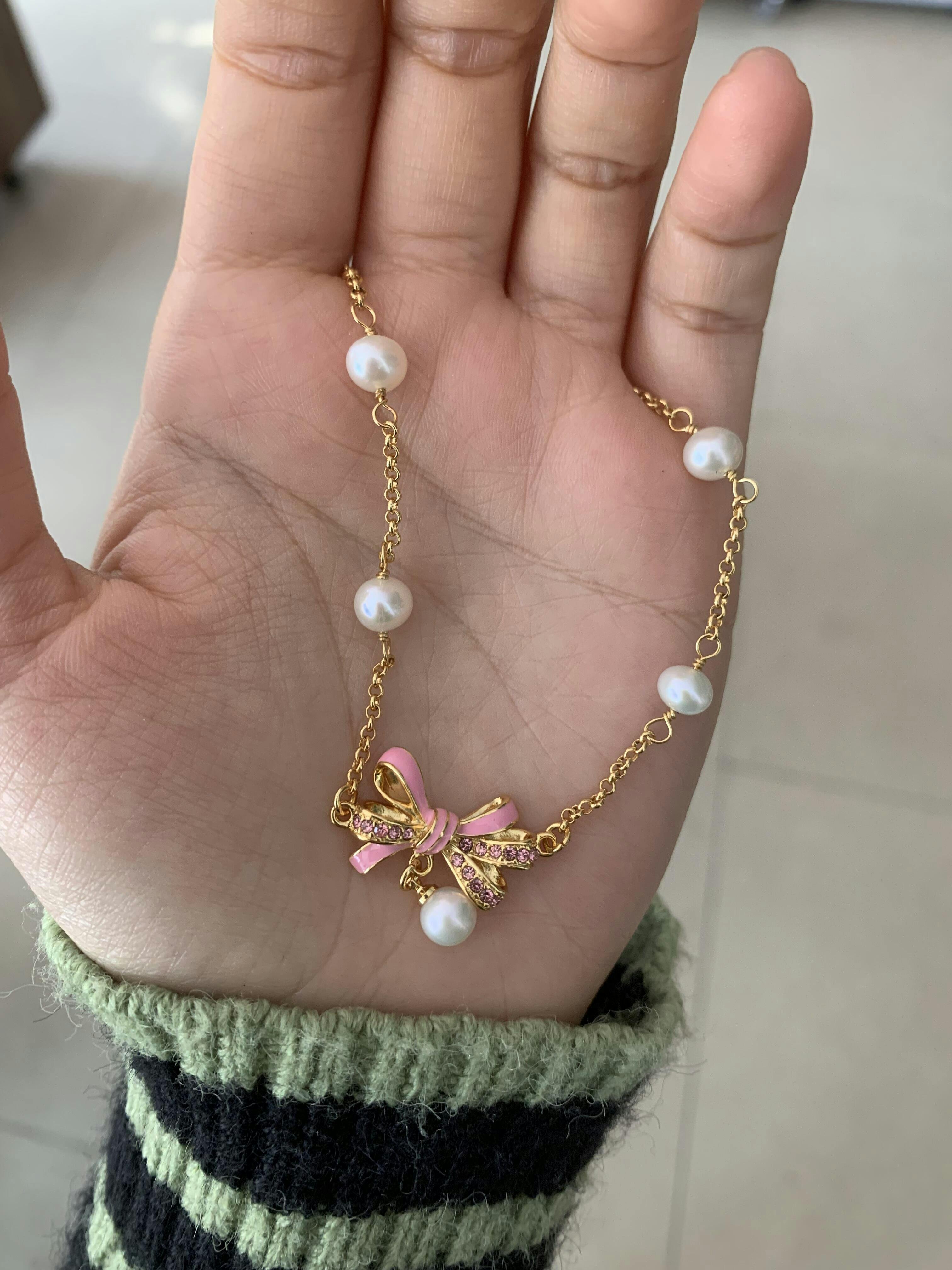 The "Butterfly Knot Pearl Bracelet" exudes a refined elegance with its exquisite combination of lustrous pearls and a delicate bow centerpiece. This bracelet is beautifully crafted with a gold-tone chain that adds a touch of sophistication. The bow is adorned with sparkling pink stones, enhancing its charm and making it a perfect accessory for both casual and formal occasions.