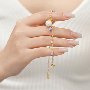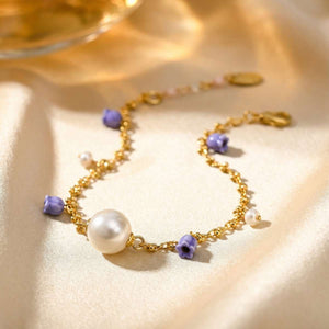 Light, graceful, and full of poetic charm, the Lily Of The Valley Bracelet is inspired by tiny bells swaying in a spring breeze. A fine gold-tone chain is adorned with delicate lavender lily charms and soft pearl accents, finished with a single luminous pearl drop at the centre. Elegant yet effortless, it adds a gentle sparkle to the wrist—perfect for everyday wear or as a thoughtful, romantic gift.