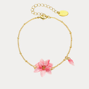 Discover the delicate charm of our Magnolia Bracelet. This exquisite piece features a beautifully crafted pink magnolia flower as its centerpiece, surrounded by elegant dark pearls on a fine golden chain. The intricate enamel detailing captures the flower's natural beauty, symbolizing nobility and love of nature. Perfect for adding a touch of sophistication and femininity to any outfit, this bracelet is a timeless accessory for any occasion.