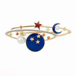 This Celestial Brooch captures the magical allure of the night sky with its enchanting celestial design. This bangle features a stunning array of elements: a vibrant blue disc adorned with silver stars, a lustrous pearl, a crescent moon, and scattered star accents, all complemented by twinkling gemstones in shades of orange and green.