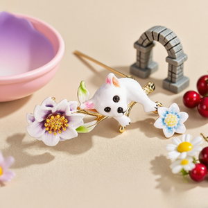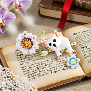 Add a playful touch to your outfit with this charming Dog Brooch. Featuring an adorable white dog lounging on a golden branch beside blooming purple and blue flowers, this piece beautifully blends nature and whimsy. Hand-painted enamel details and sparkling gold-tone accents bring it to life, making it a delightful accessory for dog lovers and anyone who enjoys unique, artistic jewellery.