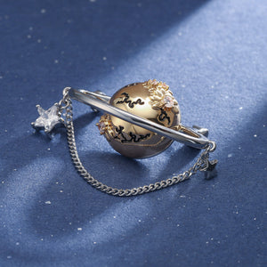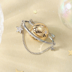 Embrace the cosmos with this intricate planet-inspired brooch, featuring a golden globe encircled by silver rings and tiny star charms. A whimsical accessory that adds an intergalactic flair to your outfit.