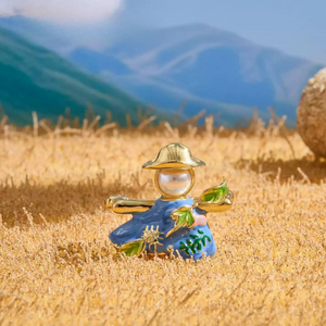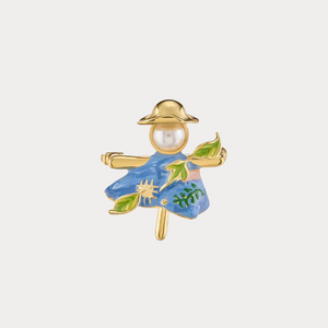 Bursting with playful charm, this whimsical brooch features a delightful scarecrow design with a luminous pearl face beneath a golden hat. The figure’s vibrant blue enamel coat is adorned with golden sun and green leaf motifs, adding a touch of countryside cheer. Perfect for brightening jackets, scarves, or bags, it’s a unique accessory that blends artistry, colour, and personality in one charming piece.