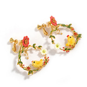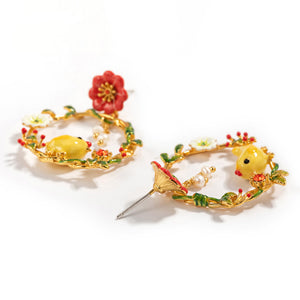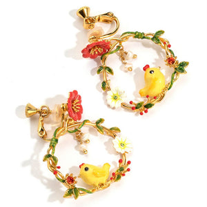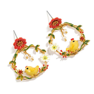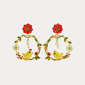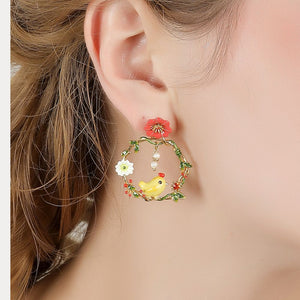 Each earring showcases a whimsical scene featuring a yellow chick, vibrant flowers, and delicate leaves, all intricately hand-enameled. The hoops are adorned with sparkling stones and pearl accents, adding a touch of elegance to the playful design. These earrings are perfect for adding a cheerful and unique flair to your accessory collection.