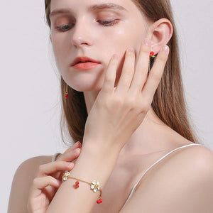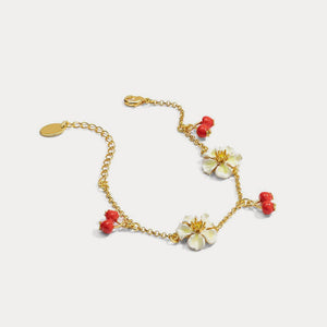 This elegant golden chain bracelet from the Cranberry Collection features a charming cranberry flower charm, interspersed with clusters of cranberry beads. The hand-enamelled charms impart a sweet fragrance to this bracelet, making it a perfect gift for any woman. This delicate bracelet is sure to add a touch of elegance to her wrist and complement her daily outfits beautifully. Surprise her with this exquisite piece, and it will never fail to impress.