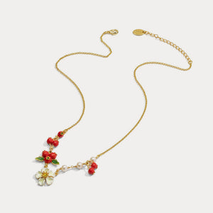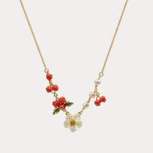 This feminine and delicate necklace features a charming white cranberry flower and vibrant red cranberries, both crafted from enamel. The thin chain is gracefully adorned with three round white pearls, enhancing the elegance of the white flower and highlighting the striking red fruit. This piece beautifully enlightens your neckline, adding a touch of sophistication to any outfit.