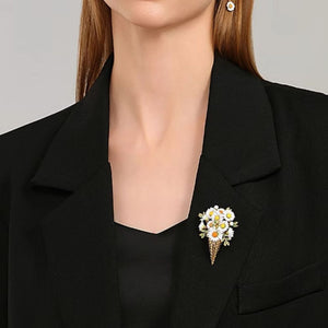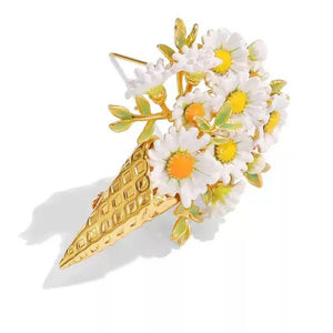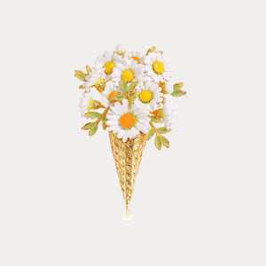 This Daisy Brooch is a whimsical and creative accessory that merges the charm of spring flowers with the playful shape of an ice cream cone. This brooch features a cluster of white daisies with golden centers, nestled within glossy green leaves, all beautifully set in a golden cone. It's a delightful piece that adds a quirky yet elegant touch to any outfit, ideal for those who love unique and eye-catching jewelry.