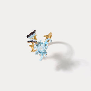 This enchanting ring captures the elegance of nature with a soft blue chrysanthemum and a gracefully poised butterfly. Crafted with intricate enamel detailing, it wraps around your finger like a poetic moment frozen in time.