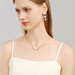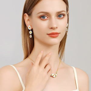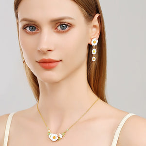 Daisy Drop Earrings represent the quintessence of natural splendor, meticulously handcrafted with 18K gold plated over brass and adorned with fine enamel accents. Their enchanting design evokes the tranquility of pastoral charm and the sophistication of cottage-style grace, rendering them an ideal complement for any setting. Ideal for infusing your daily style with a dose of cheerfulness or providing a whimsical touch to your ensemble.