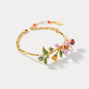 A charming bracelet featuring a delicate daisy bloom, fresh green leaves, and an adorable ladybug perched on a golden branch. Hand-painted enamel details bring this floral design to life, creating a whimsical and nature-inspired accessory.