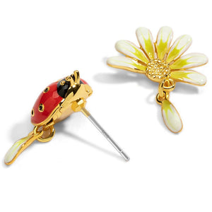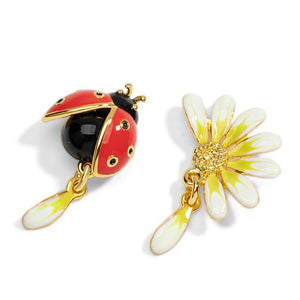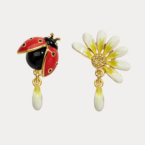 This playful pair features a vibrant ladybug and a delicate daisy flower, each crafted with intricate detail and accented with gold-tone highlights. These earrings are perfect for adding a touch of whimsy and elegance to your look, bringing a bit of nature-inspired charm to any outfit.