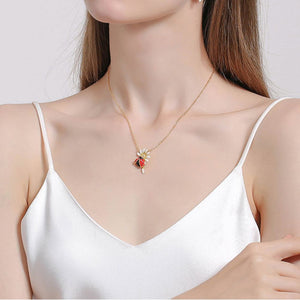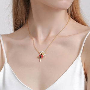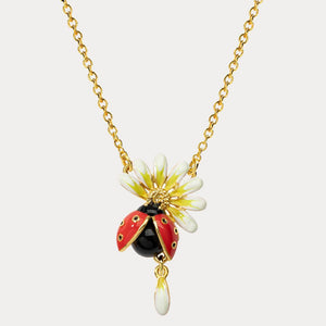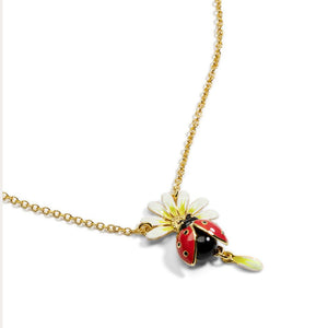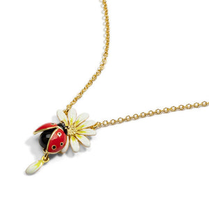 This delightful necklace features a charming ladybug perched on a daisy flower, all set on a delicate gold-tone chain. The playful design and vibrant colors make it a fun and whimsical accessory, perfect for adding a touch of nature-inspired beauty to any outfit.
