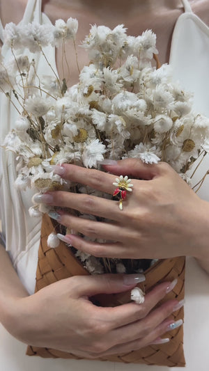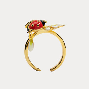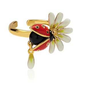 This charming ring features a playful ladybug resting on a delicate daisy, all set on a sleek gold-tone band. The intricate details and vibrant colors make it a fun and eye-catching accessory, perfect for bringing a bit of nature's beauty into your everyday style.
