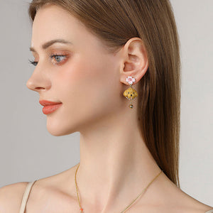 These adorable earrings feature a lifelike poodle head, meticulously crafted from hand-painted enamel for a realistic and endearing look. The poodles are adorned with delicate pearls around their necks, adding a touch of sophistication. Above the poodles, a pink enamel flower with a sparkling center enhances the whimsical design. Dangling golden bells add a playful element, making these earrings a delightful accessory for any dog lover.