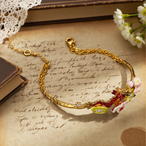 Harness the power of legend with this Dragon Lotus Bracelet. A fiery red dragon weaves through delicate lotus blossoms, accented with lustrous pearls and sparkling details, symbolising strength, renewal, and harmony. The gold-tone chain enhances its elegance, while hand-painted enamel adds vibrant artistry. A bold statement piece for those who love mythical beauty and nature-inspired jewellery.