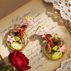 Unleash mythical elegance with these Dragon Lotus Hoop Earrings. Each piece features a fiery red dragon coiled within golden hoops, surrounded by blooming lotus flowers, pearls, and sparkling accents. The lotus stud detail adds an extra touch of grace, symbolising renewal and harmony. Hand-painted enamel and gold-tone craftsmanship make these earrings a bold, artistic statement for those who love jewellery with both power and beauty.