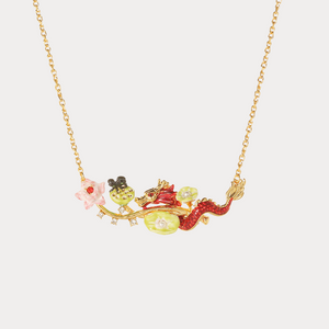 Embrace mythical beauty with this Dragon Lotus Necklace. A majestic red dragon coils gracefully around blooming lotus flowers, accented with pearls and sparkling details that symbolise strength, renewal, and harmony. Hand-painted enamel and gold-tone craftsmanship highlight the artistry, while the elegant chain adds a refined finish. A bold statement piece for those who love jewellery that blends fantasy with natural elegance.