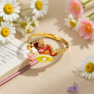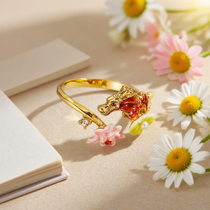 Embrace strength and elegance with this Dragon Lotus Ring. Featuring a fiery red dragon intertwined with delicate lotus blossoms, the design symbolises power, renewal, and harmony. Hand-painted enamel details, a luminous pearl accent, and sparkling crystals highlight the artistry of this gold-tone ring. A bold statement piece perfect for those who love mythical charm and nature-inspired jewellery.
