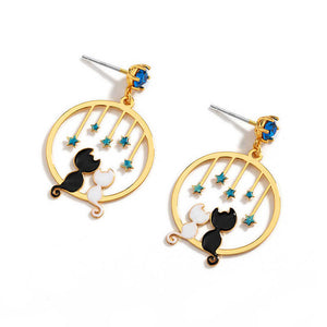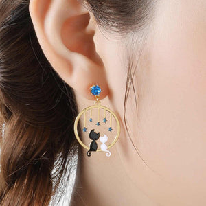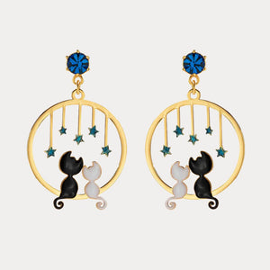 Featuring two cats—one black, one white—gazing together at a sky filled with sparkling stars, these earrings capture a magical moment of companionship and wonder. The gold-tone circular frame and dangling blue stars add a touch of elegance, while the deep blue crystal stud enhances the celestial theme. Perfect for cat lovers and dreamers alike.