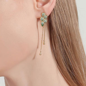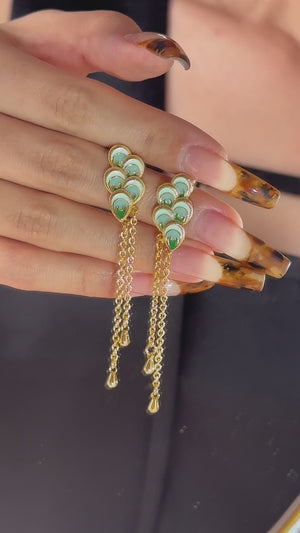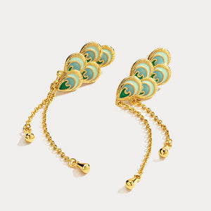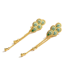 Inspired by the graceful allure of peacock feathers, each earring features multiple intricately detailed enamel feathers in shades of teal and gold, cascading beautifully to create a stunning layered effect.