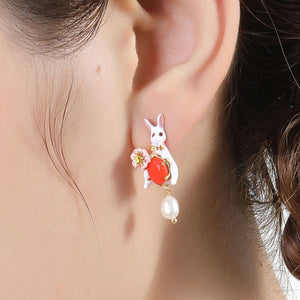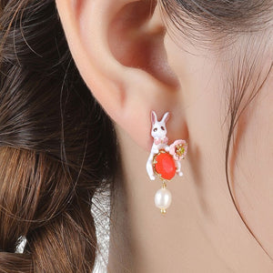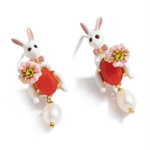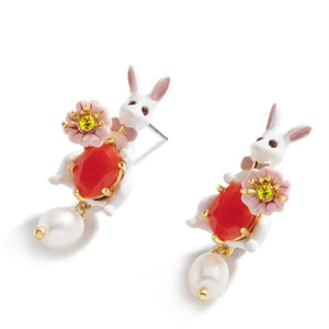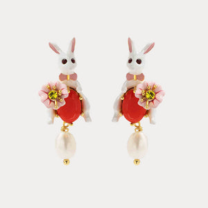 The "Rabbit Drop Earring" feature charming rabbits holding pink flowers and vibrant red gemstones, accented with elegant pearl drops. These earrings offer a delightful mix of playful and sophisticated elements, perfect for adding a touch of whimsy to any ensemble.