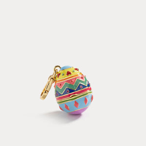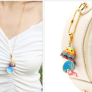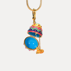This Pendant is a distinct piece that offers a nod to your astrological leanings, with a bright egg sphere and an intricately designed cap adorned with colorful patterns, accented with a chain and a striking animal pendant. It's a unique accessory that adds a pop of color and a touch of playfulness to any outfit.