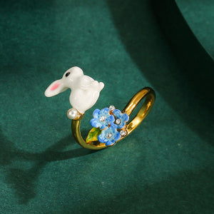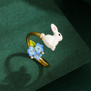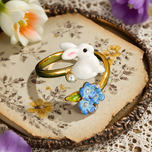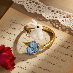 This whimsical ring captures the innocence and beauty of nature, featuring an adorable white bunny nestled beside a blooming blue flower. Crafted with meticulous enamel detailing and adorned with a lustrous pearl accent, this adjustable gold-tone ring brings an ethereal charm to any outfit. Whether worn alone or paired with other floral accessories, it adds a dreamy, fairy-tale touch to your jewellery collection.