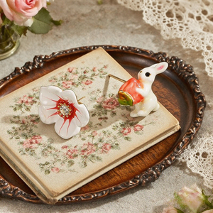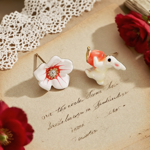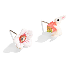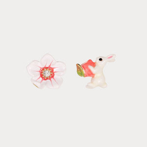 These adorable mismatched earrings celebrate the charm of nature and the sweetness of peaches. One earring features a delicate white bunny holding a vibrant peach, symbolising good fortune and prosperity, while the other showcases a beautifully hand-painted peach blossom with a sparkling crystal centre. The playful and whimsical design makes these earrings a delightful statement piece, perfect for adding a touch of cuteness and charm to any look.