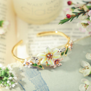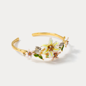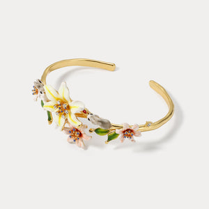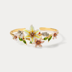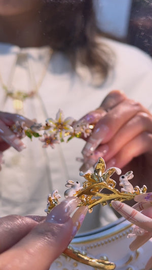 Embrace the beauty of spring with the Fluffy Bunny Cuff Bracelet. This intricately designed piece showcases delicate flowers and adorable bunnies, capturing the essence of a magical meadow in full bloom. Ideal for animal and nature lovers.