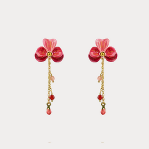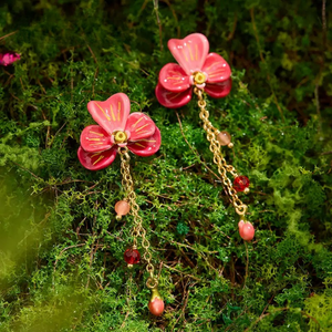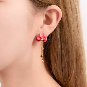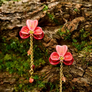 Inspired by the vivid beauty of blooming bougainvillea, these earrings feature hand-painted enamel petals in rich shades of pink and red. Delicate gold chains cascade gracefully, adorned with small beads and a teardrop accent for a touch of movement and sparkle. Perfect for adding a vibrant, nature-inspired flourish to your look, they capture the essence of tropical elegance in every detail.