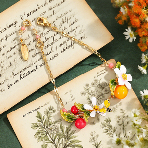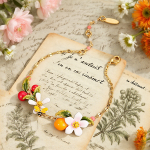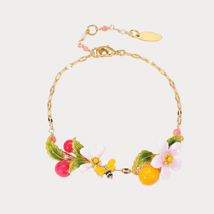 The Cherry Tomato Bracelet captures the joy of a blooming orchard, featuring hand-painted enamel flowers, vibrant orange and red fruits, and playful green leaves. A delicate golden bee detail adds a whimsical touch, while the adjustable chain ensures a comfortable fit. Perfect for adding a burst of colour and nature-inspired charm to your everyday style.