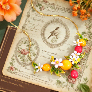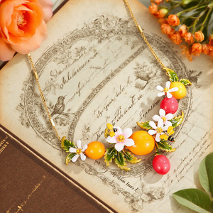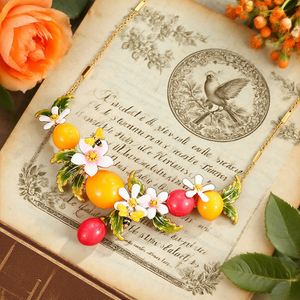 The Cherry Tomato Necklace bursts with fresh vitality, featuring hand-painted orange and red enamel fruits paired with delicate white blossoms and green leaves. Accented by golden details and playful bee motifs, this necklace captures the essence of a sunny orchard in bloom. A joyful statement piece, it’s perfect for bringing a pop of colour and nature-inspired charm to any look.