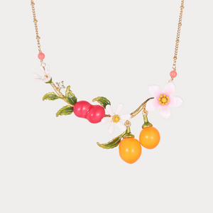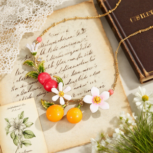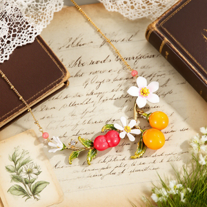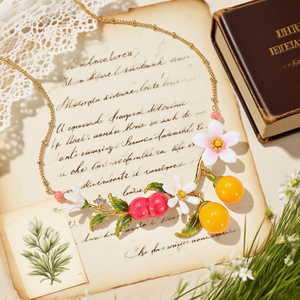Bursting with colour and charm, the Cherry Tomato Necklace combines vibrant enamel fruits with delicate blossoms and lush green leaves. Golden accents highlight the lively design, evoking the warmth of sunlit orchards in full bloom. Playful yet elegant, this necklace is perfect for adding a fresh, joyful touch to your everyday or special occasion look.