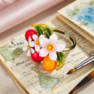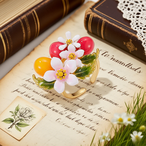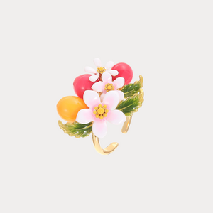 Brighten your style with the playful charm of the Cherry Tomato Ring. Adorned with vivid enamel fruits, delicate white blossoms, and lush green leaves, this ring captures the beauty of a blooming orchard. The golden band adds elegance while the vibrant details bring a joyful pop of colour — perfect for adding a fresh, lively accent to any outfit.