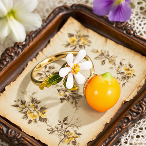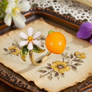 Celebrate the freshness of spring with the Cherry Tomato Ring. Featuring a delicate white blossom alongside a vibrant cherry tomato fruit motif, this enchanting design brings nature’s vitality to your fingertips. The gold-tone finish enhances its playful yet elegant charm, making it the perfect accessory for both everyday wear and special moments.