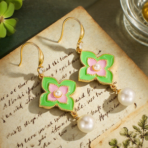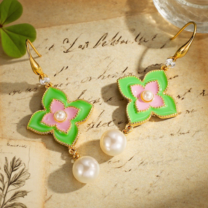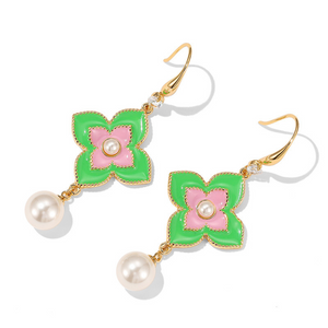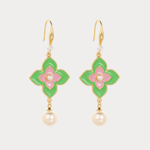 Add a touch of luck and elegance with these Four-Leaf Clover Pearl Earrings. Featuring a clover design in vibrant green and soft pink enamel, each earring is centred with a lustrous pearl and finished with a dangling pearl drop for timeless charm. Gold-tone detailing and sparkling crystal accents enhance their refined beauty. A perfect blend of playful symbolism and classic sophistication, ideal for any occasion.