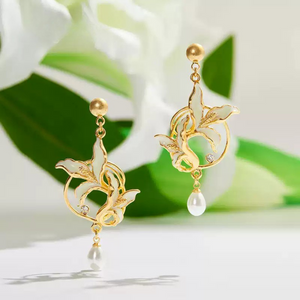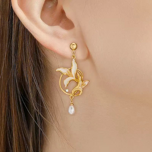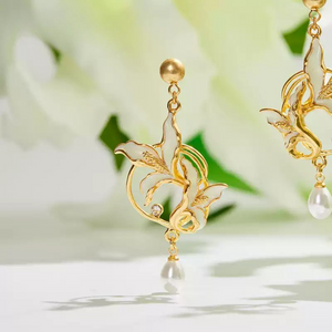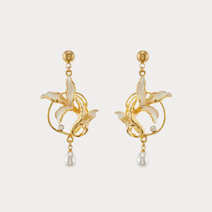 Exuding timeless floral elegance, these earrings feature delicate calla lily blooms in smooth white enamel, outlined in gleaming gold. Sparkling crystals accentuate the graceful curves, while a dangling teardrop pearl adds movement and sophistication. Perfect for both formal occasions and everyday elegance, they bring a refined, nature-inspired charm to any jewellery collection.