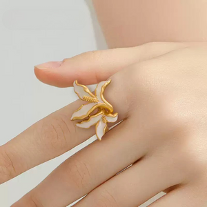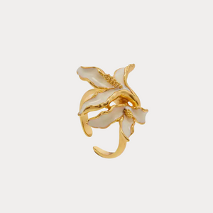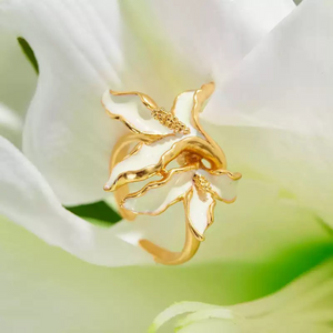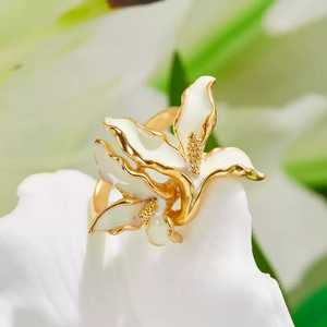 Inspired by the timeless elegance of calla lilies, this Golden Calla Lily Ring features graceful petals crafted in smooth white enamel, outlined in shimmering gold. The design captures the flower’s natural curves and delicate beauty, while textured golden stamens add a touch of realism. Perfect for adding a sophisticated floral accent to any look, this piece embodies both charm and refinement.