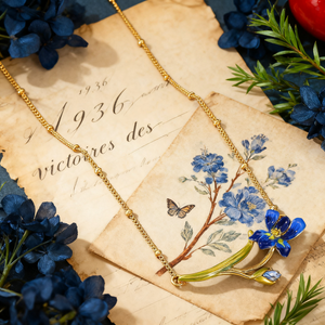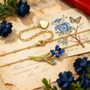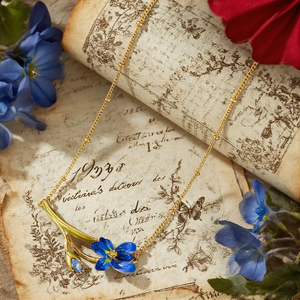 Graceful and enchanting, the Iris Flower Necklace captures the elegance of nature in bloom. A vivid blue iris, hand-painted with delicate enamel, blossoms at the centre of a golden branch, complete with a budding crystal-accented stem. The fine gold chain is subtly detailed, adding sophistication without taking attention away from the flower’s brilliance. A symbol of wisdom, hope, and spring renewal, this necklace makes a striking statement for everyday wear or special occasions.