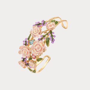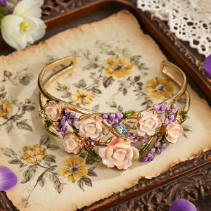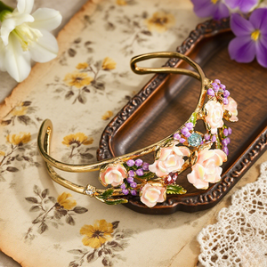 The Lavender Bangle Bracelet is a statement of garden-inspired elegance, adorned with hand-painted roses, delicate lavender sprigs, and sparkling crystal accents. Crafted with intricate golden detailing, this open bangle design wraps your wrist in a bloom of timeless beauty. Perfect for adding romance and sophistication to both everyday wear and special occasions.