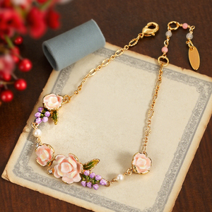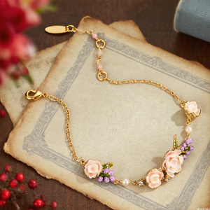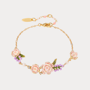 The Lavender Bracelet brings floral elegance to your wrist with hand-painted roses, lavender accents, and luminous pearls. Its golden chain is delicately detailed, balancing romance and sophistication. A graceful piece that adds a touch of springtime charm to any outfit, perfect for both daily wear and special occasions.
