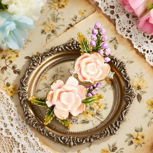 The Lavender Brooch blossoms with timeless elegance, showcasing two hand-painted pink roses accented by delicate lavender buds and sparkling crystals. Golden leaves and stems complete the design, creating a graceful piece that captures the romance of a blooming garden. Perfect for adding floral sophistication to coats, scarves, or dresses.
