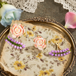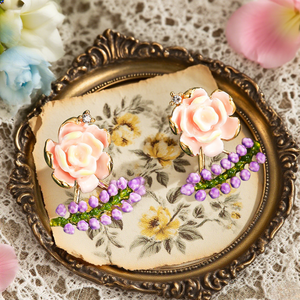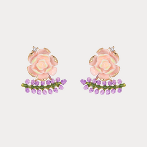 The Lavender Earrings bloom with romantic elegance, featuring hand-painted pink roses adorned with delicate lavender sprigs. Golden detailing and tiny crystal accents add a touch of sparkle, creating a fresh, garden-inspired design. Perfect for adding floral charm to everyday looks or elevating your evening style with subtle sophistication.