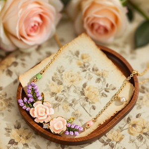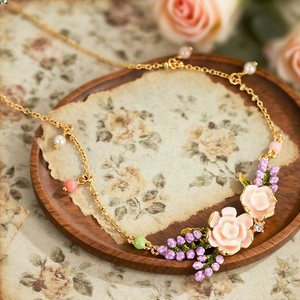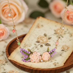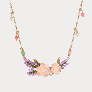 The Lavender Necklace blossoms with romance and charm, featuring hand-painted pink roses paired with delicate lavender buds. Accented with colorful beads and a sparkling crystal, this necklace brings a touch of whimsical elegance to your look. Perfect for garden parties, special occasions, or simply adding a floral flourish to your everyday style.