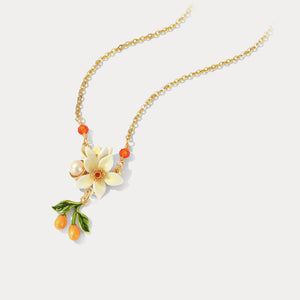 The Verdivine Orange Blossom Necklace is a radiant piece of jewelry that captures the beauty of nature. Adorned with a pearl that complements the enamel orange blossom and leaf detail, this necklace hangs gracefully, offering an eye-catching highlight to any ensemble. Its design promises to add an air of elegance and a whisper of nature’s serenity to your look.