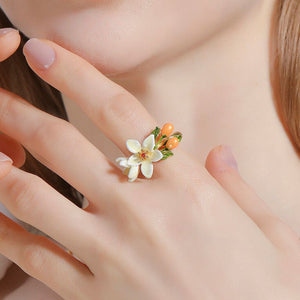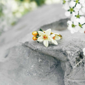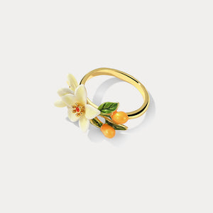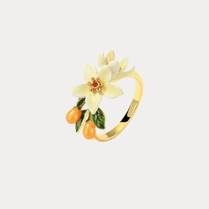 The Verdivine Orange Blossom Ring is a celebration of nature's delicate artistry, beautifully rendered in brass enamel. With its 18k gold band and exquisite enamel work, this ring is a standout piece that captures the essence of vintage charm with a modern twist. It's an elegant homage to the cottagecore aesthetic, designed to add a touch of luxury to any celebration.