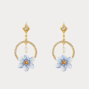 Embrace timeless floral elegance with the Tulip Hoop Earrings, a captivating blend of artistry and sophistication. Each earring features a hand-painted blue-and-white tulip bloom suspended from a gold-tone hoop, encrusted with shimmering crystals. A single lustrous pearl dangles gracefully at the centre, adding a touch of refined charm. Perfect for both casual chic and evening glamour, these earrings bring a fresh, nature-inspired beauty to any outfit.