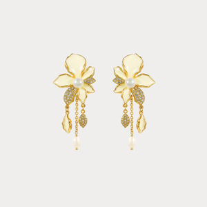 Delicate yet luminous, the White Iris Flower Earrings bloom in soft ivory enamel with a polished gold outline for an elegant, refined finish. A pearl-like centre adds a gentle glow, while pavé crystal leaves and cascading gold chains create a subtle sparkle and graceful movement. Perfect for weddings, dates, or everyday moments when you want a touch of floral romance.
